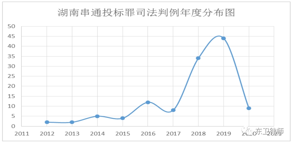 从以上曲线图可以看出,2016年之前,全省各级法院涉及“串通投标罪”的判例数保持较低水平的平稳,2016年后上升明显,尤其2018年、2019年的判例数急剧攀升;2020年上半年因新冠疫情影响,涉及“串通投标罪”的司法判例数回落较大,但可以预计,随着全省今年5月份以来开展工程建设招投标专项整治工作,2020年下半年及2021年“串通投标罪”的司法判例将会较快增长。