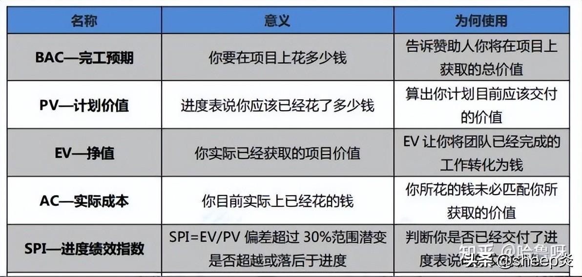 EV(Earned Value):挣值(实现值)完成工作对应的预算费用 。AC(ActualCost):实际成本,完成工作实际花费的成本。PV(Planned Value):计划成本,计划完成工作的预算费用。BAC:项目完工预期。