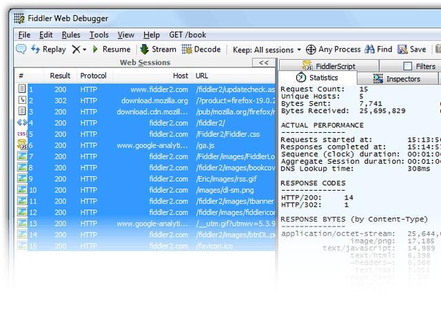 分析Web应用程序的性能:查看Fiddler的“统计信息”标签,可以了解应用程序的整体性能指标。可以选择所有会话以查看按内容类型或饼状图细分的请求总数和发送和接收的字节数等综合统计数据。