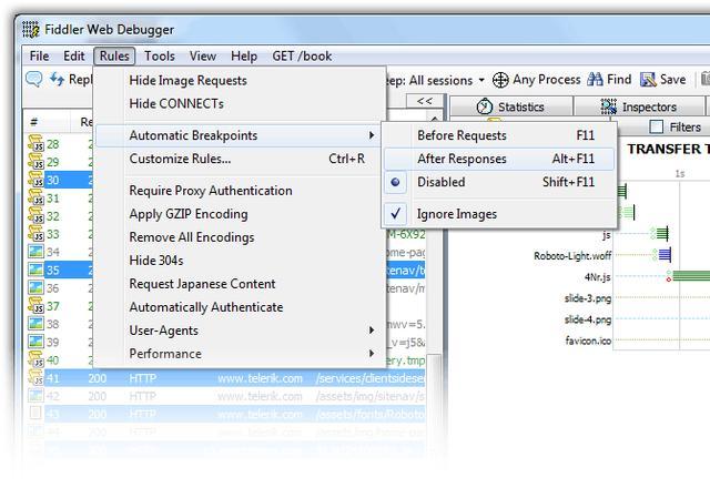 设置断点:通过在每个请求或响应之后/之前设置断点或添加自定义的断点来修改会话。也可以使用quick exec框为遇到特定URL的情况创建简单的断点。然后,Fiddler会暂停会话的处理,并允许手动更改请求和响应。还可以选择将自动返回的响应。