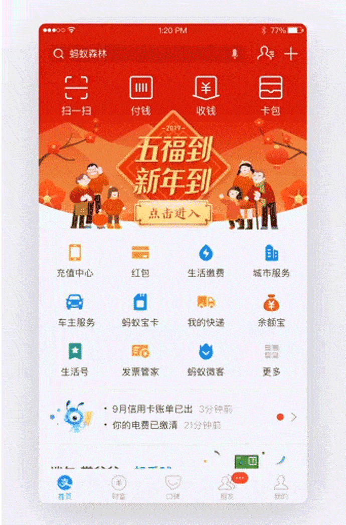 支付宝的集五福活动把五福做成了开屏动画,动画结束时落在了页面的顶部五福活动入口,动画上的前后无缝承接既起到了活动入口宣传的作用也帮助用户强化了对于活动的理解。
