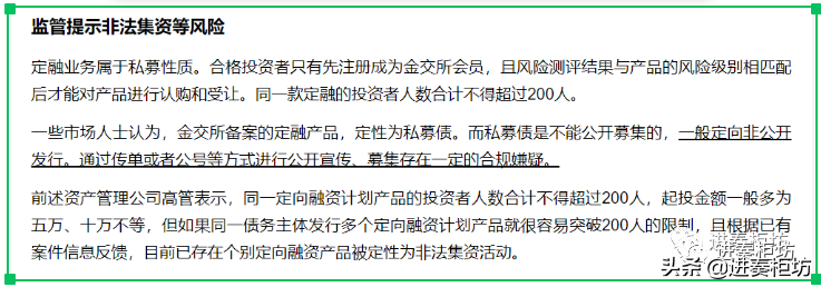 截图是21世纪报道对金交所产品的描述,掌柜认为有部分容易引起误导,所以这里补充说明一下,说得不对和不足的可私信掌柜。在报道中提到“同一定向融资计划产品的投资者人数合计不得超过200人,起投金额一般多为五万、十万不等,但如果同一债务主体发行多个定向融资计划产品就很容易突破200人的限制,且根据已有案件信息反馈,目前已存在个别定向融资产品被定性为非法集资活动。”结合报道非公开发行的描述,加上这句话容易给人造成误导认为:定融计划是私募类资管产品,且起投门槛可以是5-10万,只是在突破了200人限制后,才可能涉嫌违规的。