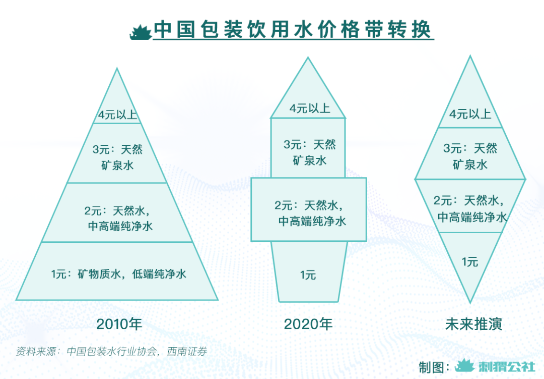据中国包装水行业协会,中国包装饮用水的价格结构已经从正三角逐渐走向纺锤形:2010年左右,底层定价为1-2元的纯净水、天然水和矿物质水占据市场绝对主流;经过10余年发展,目前2元天然水和中高端纯净水愈来愈突出,而在未来,伴随着消费升级,1元饮用水市场逐步萎缩,3元产品逐渐崛起。