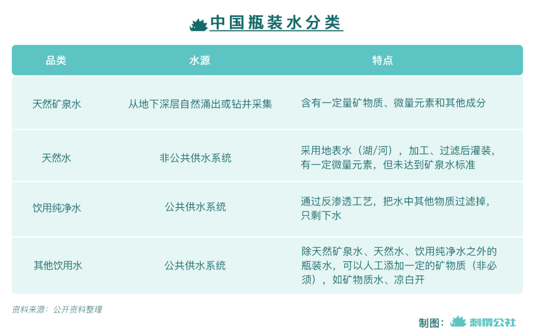 时至今日,瓶装水已成为中国软饮料中最大的细分品类,市场规模超过两千亿元,其内部除天然矿泉水外还延伸出了天然水、饮用纯净水、矿物质水等多个类别。据农夫山泉招股说明书,天然水源瓶装水的增长速度最快——2014-2019年,天然水的复合年增长率远超行业平均(11%),达到24.8%,天然矿泉水次之,为18.4%。