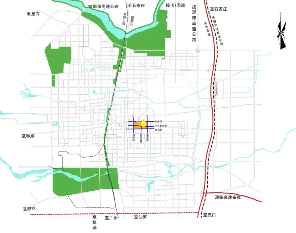 项目位于邢台市,南临中兴东大街(红线宽度50米),北接东关街(红线宽度25米),西临路家园路(红线宽度30米),东侧为现有小区。