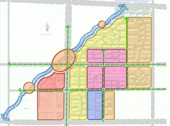 五轴:主要是指现有的几条主要的城市道路穿过小区所形成的五条景观轴线。他们形成了整个小区的道路骨架,也是小区内的视觉景观通廊。