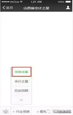 会计人员可使用电脑登录会计之星网站(http://www.kjzx.cn),进入首页“会计人员信息采集”专区,或手机微信添加公众号“山西省会计之星”点击“行业信息”菜单中的“信息采集”。