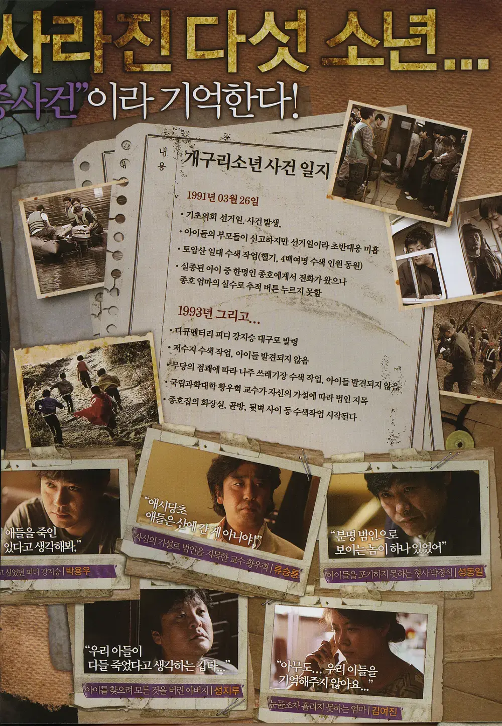 五个孩子集体失踪,谁才是幕后凶手全片充满了各种讽刺意味,对真实事件的反应和对生活的描述是彻底的。也有冷血,也有冷漠,却也无奈。 但最终给社会展示的是对真相的追溯。可惜这个案件到现在还没有真相,根据真实事件改编,是韩国三大未解迷案之一。