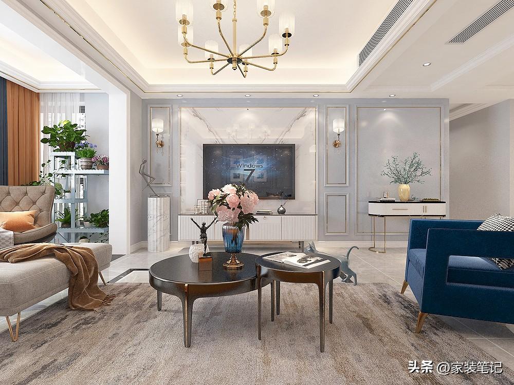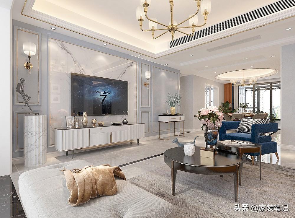 第二三个视角就是沙发墙的视角镜头了,墙面简单地做了一点线条,展现出精致一面,顶面的灯源十分丰富,不仅有主灯,还有暗藏的灯带和嵌入的射灯。
