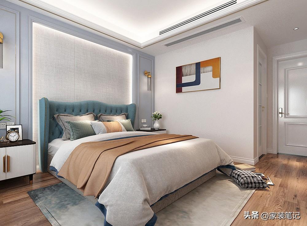 主卧室整体空间比较素雅,用天然蓝和床背景墙的淡蓝色做主色调的点缀色,让整个空间充满了活力,充满了积极向上是饱满度。