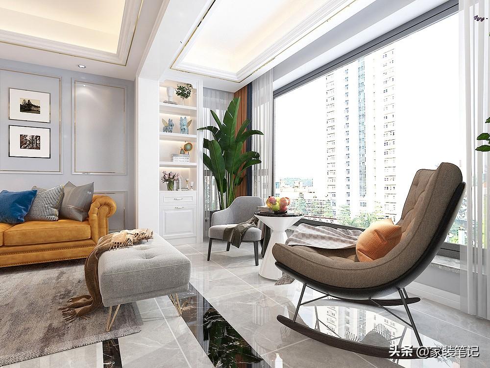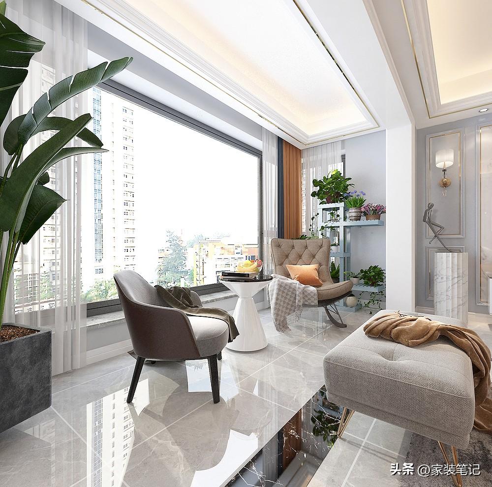 阳台地面做了通铺的设计,在两个空间之间铺贴了门槛石,区分了一下空间,空间感会好一点,但是整体感就没那么强了。两种方式各有利弊。