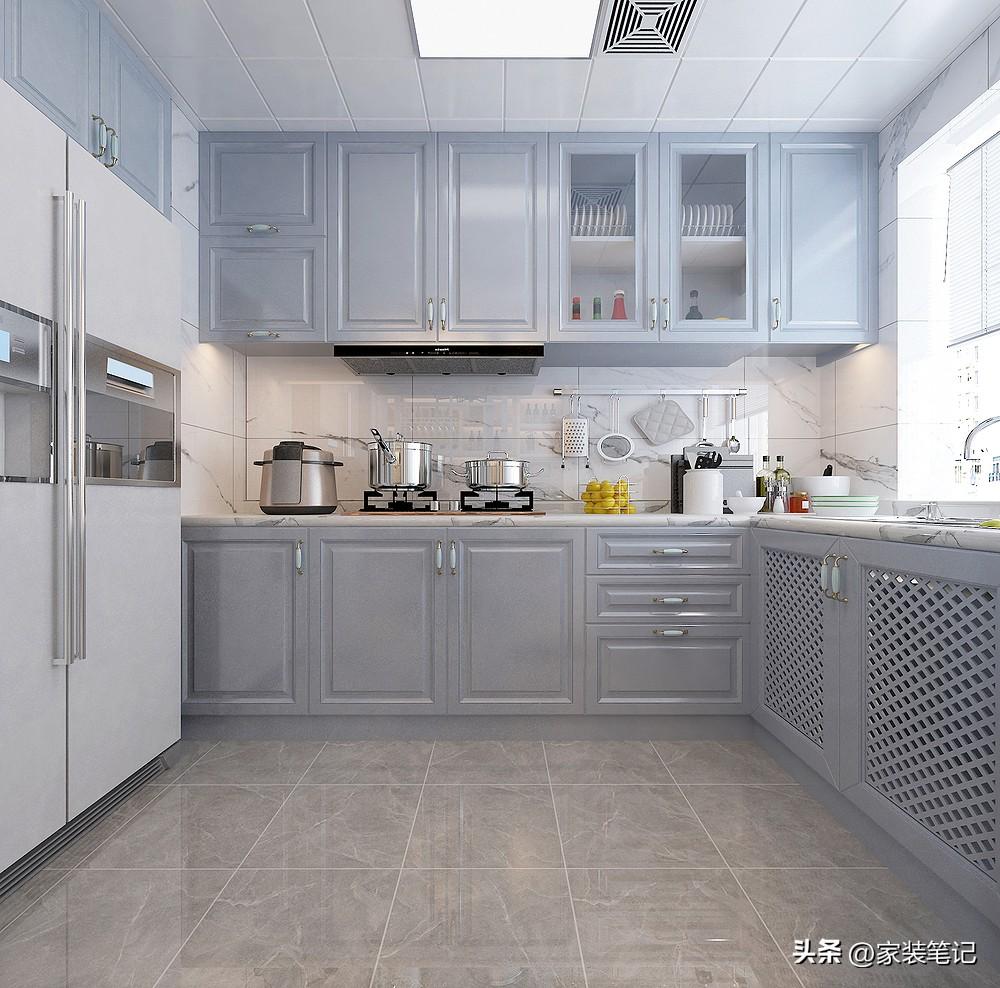 厨房就不一个空间、一个空间的介绍了。整体洗、切、炒的功能划分十分明确,柜门的色彩也选择比较好,显得比较温馨。