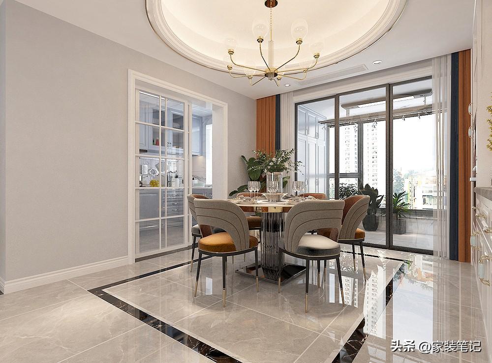 餐厅的另外一个视角,顶面造型做了一个圆形出来,刚好可以和餐桌形成呼应、对称的效果。
