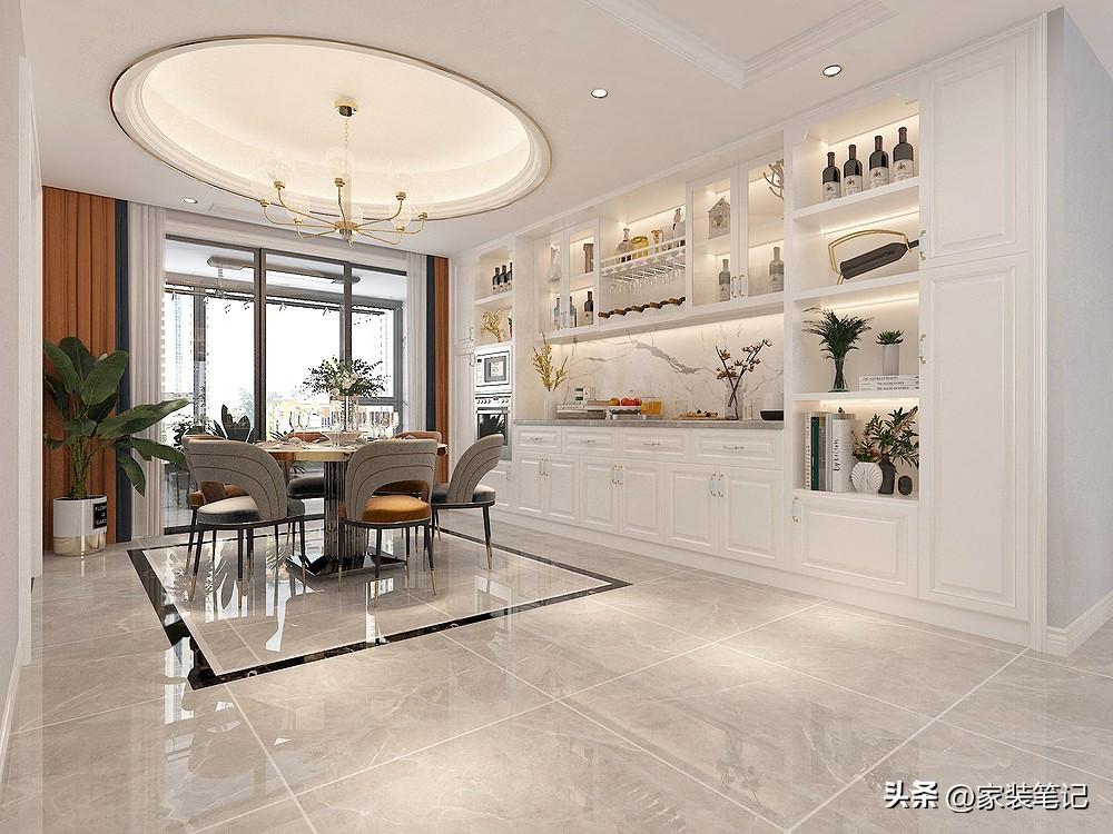 买大平层就是好,每个空间面积都很大,墙面摆放了大圆桌之后,还做了一大组的酒柜,整个空间依旧还是显得十分宽敞。中间的波导线是精装原交付就有的,没有去动地面。