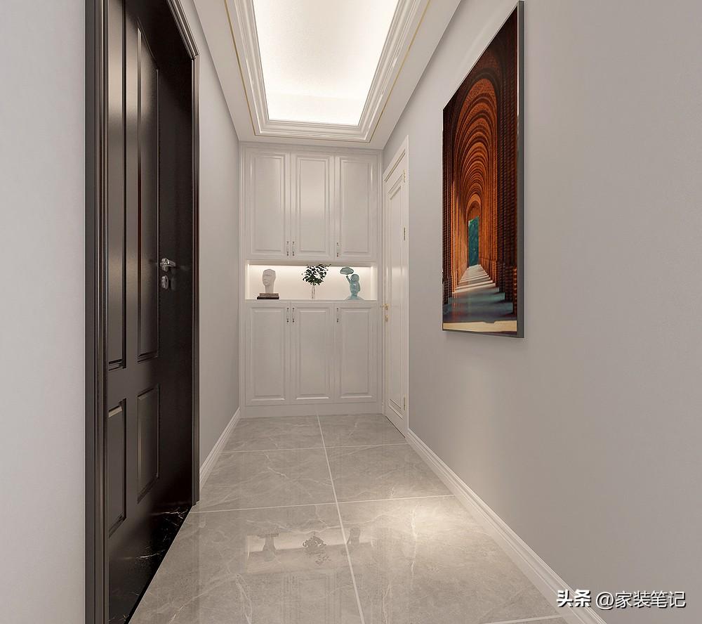 玄关空间设计布局,做得比较简单,因为空间面积受限也没多大的展示区域,原本精装的墙面并不是这样的,就是原墙漆交付,这里重新涂刷了艺术涂料,再加上一幅艺术挂画,打开房门就是一面“景”。入户门的左边尽头做了一组柜,白色的柜门加了一点凹凸的设计处理,显得精致一些。