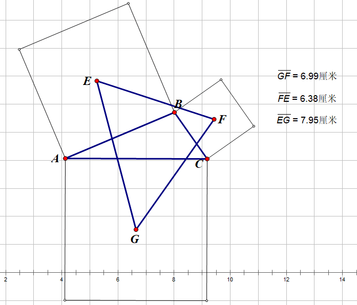 不着急。我们再仔细观察一下上面的图形。看起来,如果连接BG的话,似乎BG和EF是垂直的,而且长度还差不多。由三条边的未加限定的一般性可知,假如BG和EF垂直且相等的话,那CE和FG垂直且相等,AF和EG垂直且相等。从图上看来,似乎是成立的!不妨一试。