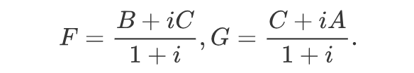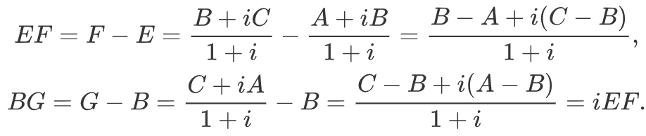 建立复平面,A,B,C,E,F,G各点分别表示一个复数。怎么样处理这六个点呢?题设是先有任意一个三角形ABC,再有三个点EFG的,所以思路就是建立EFG三个点和ABC三点之间的关系。