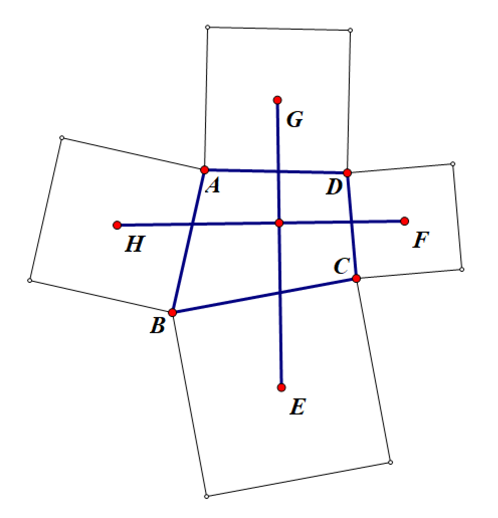 几何画板作图如下:作任意四边形ABCD,分别以各边向外做正方形,中心分别是EFGH.