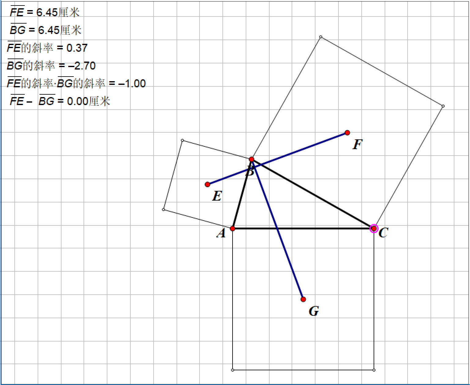 这里以验证线段BG和EF的关系为例:隐藏无关线段,连接BG。移动三角形各个顶点,观察EF、BG的长度和斜率变化,如下: