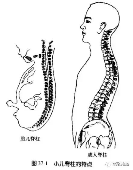刚出生的孩子脊柱是没有大人这样的生理弯曲的,3个月大小开始抬头的时候,脖子处生理弯曲出现。6个月左右开始会坐的时候,胸椎弯曲出现。练习走的时候,腰椎弯曲出现。这些生理弯曲发育到6-7岁才开始为韧带所固定。