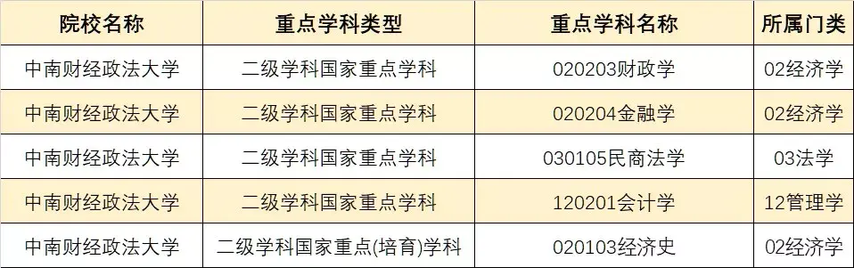 国家重点学科:4个国家二级重点学科,1个国家二级重点学科(培育),详见下表。