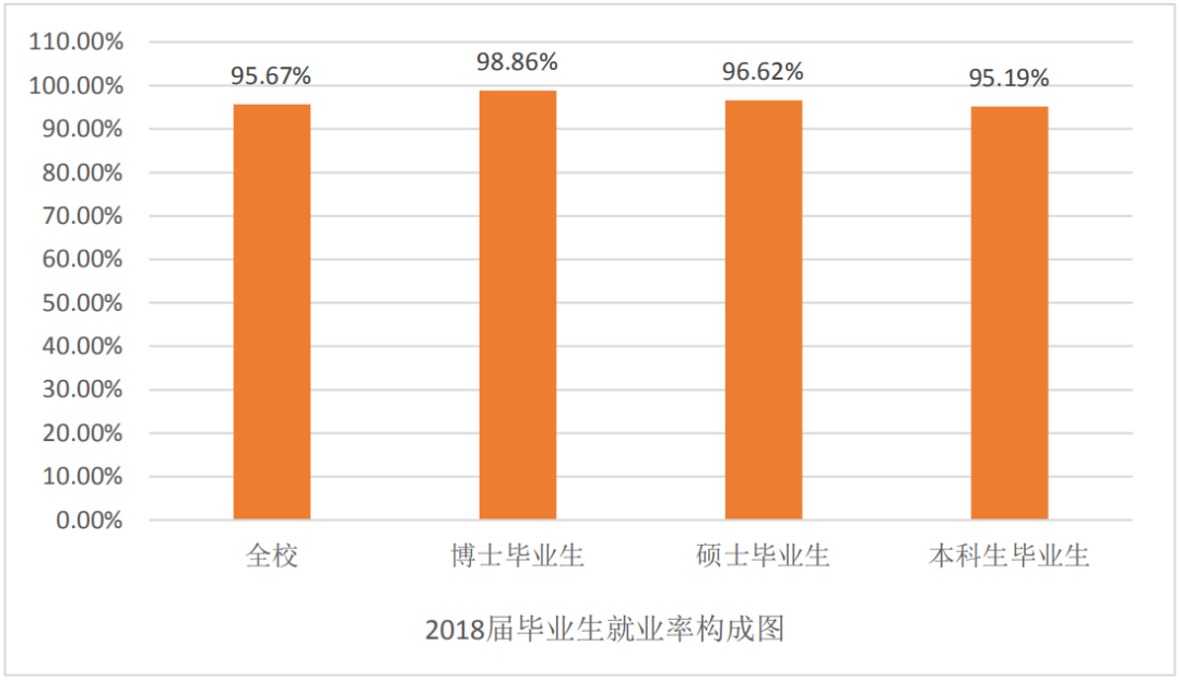 就业率统计:按照学历、院校截至 2018 年 11 月 20 日,2018 届毕业生就业率为 95.67%,与2017 届相比稳中有升。其中博士毕业生就业率为 98.86%,硕士毕业生就业率为 96.62%,本科毕业生就业率为 95.19%。