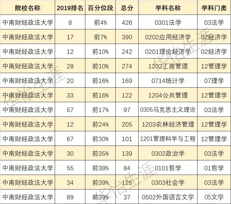 2019软科中国最好学科排名:13个学科上榜(进入前50%),法学(全国第8名)、应用经济学(全国第17名)、理论经济学(全国第12名)、工商管理(全国第28名)等4个一级学科进入前10%,详见下表。