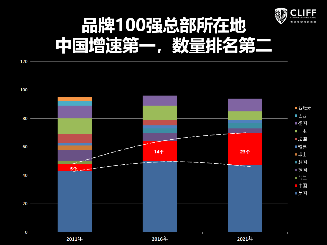另外,一组数据也说明“中国品牌”在全球范围内被广泛认可,从2011年到2021年的十年间,全球品牌100强总部所在地,中国由第五位,飙升至第二位,仅次于美国。数量由最初的5个上升至23个,增速全球第一。
