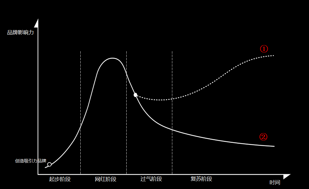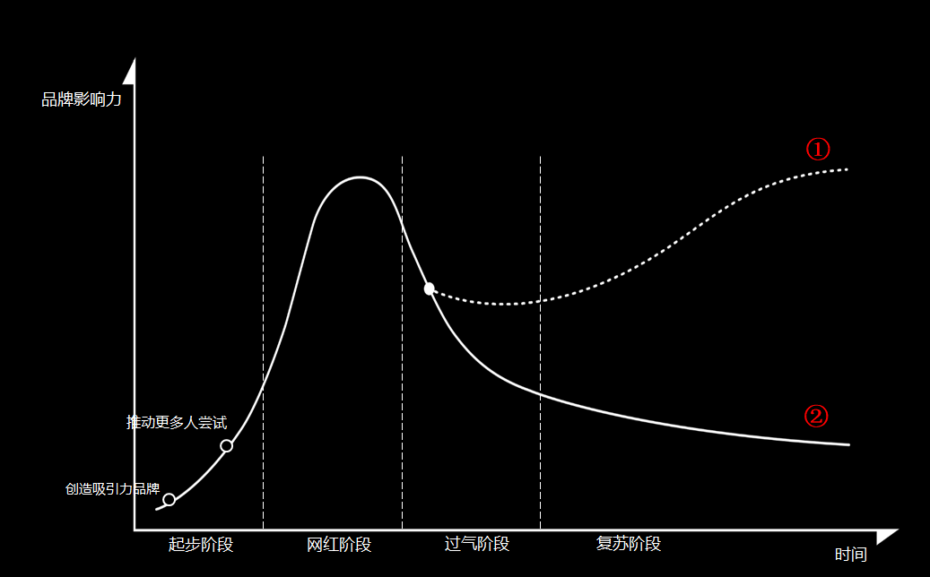 在与这些企业家沟通后,我们总结了“网红品牌”的成长路线图。它包括四个阶段,起步阶段、网红阶段、过气阶段和复苏阶段。