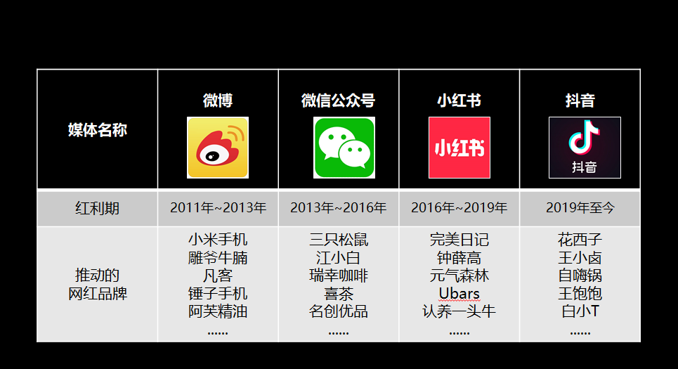 微博,2011年至2013年期间催生了小米、雕爷牛腩、凡客、锤子手机、阿芙精油等网红品牌;微信公众号,2013年至2016年期间催生了三只松鼠、江小白、瑞幸咖啡、喜茶、名创优品等网红品牌;小红书,2016年至2019年期间,催生了完美日记、钟薛高、元气森林、Ubars和认养一头牛等网红品牌;抖音,2019年至今,催生了花西子、自嗨锅、王小卤、白小T等网红品牌。当然,在这些网红品牌中,并非所有的品牌都能生存下来。