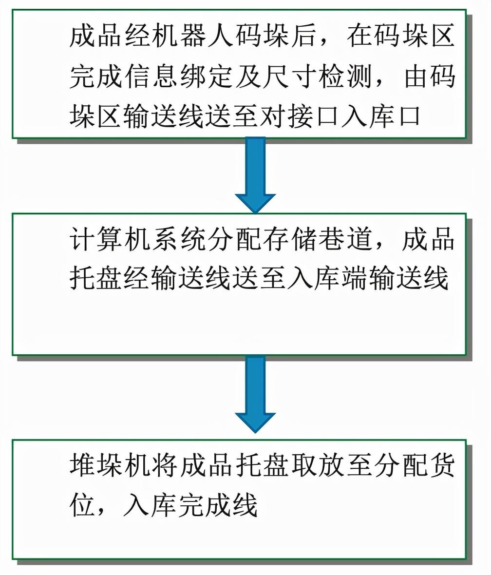 成品经机器人码垛后,在码垛区完成信息绑定及尺寸检测,由码垛区输送线送至对接口入库口,计算机系统分配存储巷道,成品托盘经输送线送至入库端输送线,然后堆垛机将成品托盘取放至分配货位,入库完成。