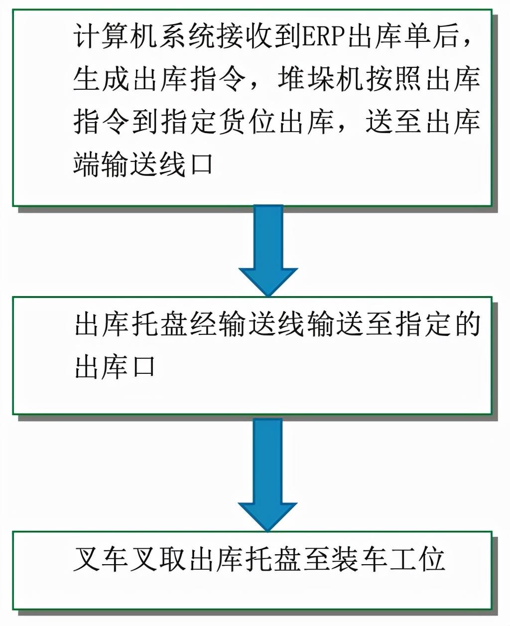 计算机系统接收到ERP出库单后,生成出库指令,堆垛机按照出库指令到指定货位出库,送至出库端输送线,出库托盘经输送线输送至指定的出库口,叉车叉取出库托盘至装车工位。