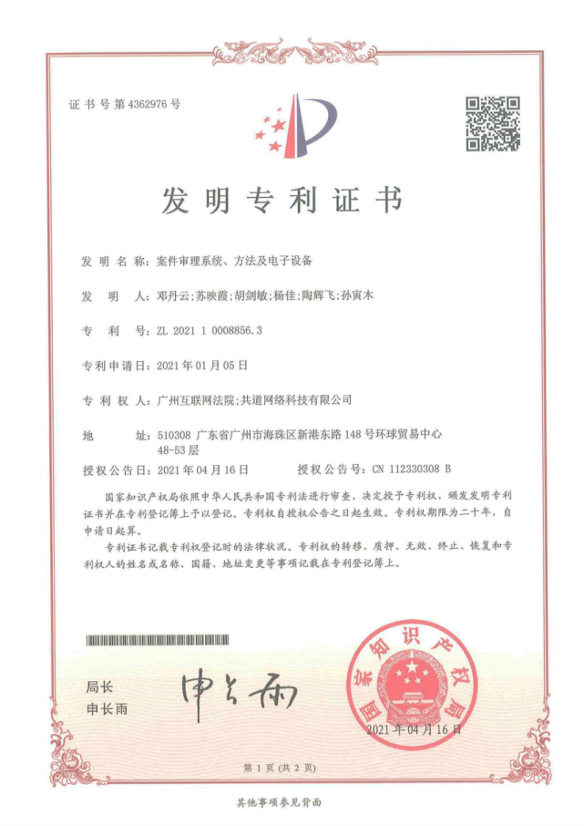 2021年6月,“ZHI系统”收到了国家知识产权局颁发的发明专利证书,此前这个系统的侵权证据比对和裁判文书生成用户界面,获得两项外观设计专利,同时计算机软件著作权还进行了登记。