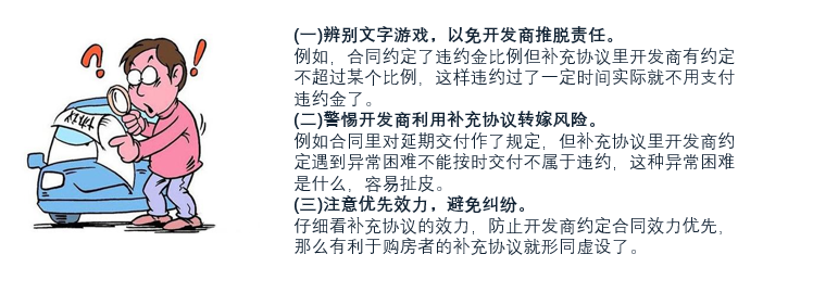 以上是签署“补充协议”中的一些经验,有一些具体情况还需购房者根据自己的特点做出具体的分析。除了购房者自己要求签订补充协议,开发商也会拿出一些补充协议让购房者签订,这时候一定要警惕。