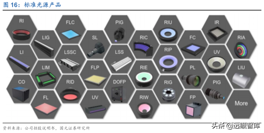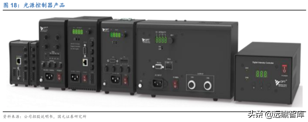 1.光源:根据公司招股说明书,公司光源产品覆盖了常见的可见光和不可见光,不可见光产品覆盖波长从280nm到405nm的紫外光及850nm到1500nm的红外光,共有38个系列,近1000款标准化产品。同时公司还根据客户需求,提供定制的光源产品。
