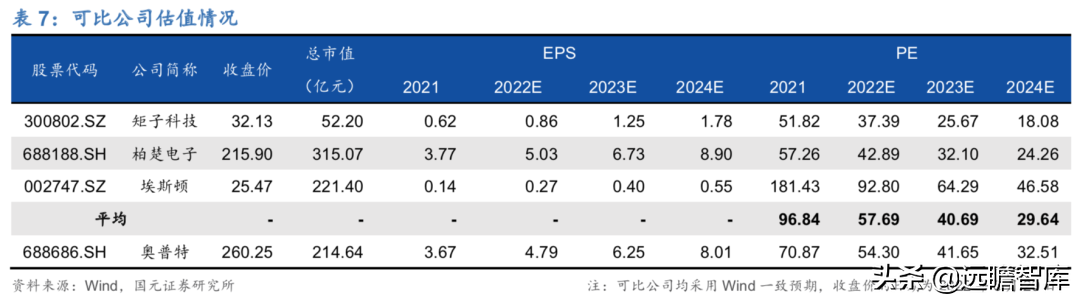 可比公司估值:在国内上市公司中,矩子科技、柏楚电子、埃斯顿也从事工业自动化相关业务,与公司主营业务相近,因此我们选择这三家公司为可比公司。