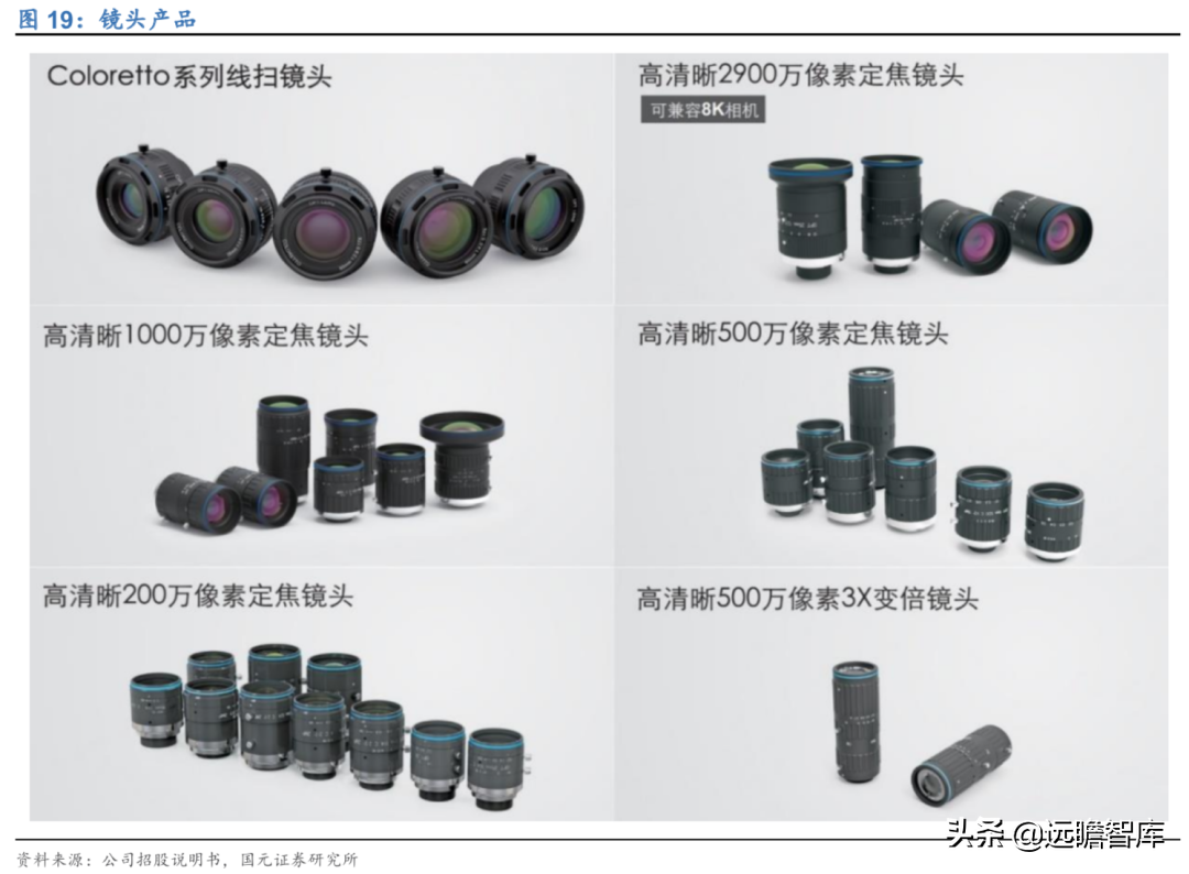 公司的自主镜头产品主要包括定焦镜头、线扫镜头等。其中,定焦镜头包括200万像素系列、500万像素系列、1000万像素系列、2900万像素系列和Cobra系列,已覆盖常用像素、焦距、像元大小和芯片尺寸,可兼容主流相机;线扫镜头包括Coloretto、Hawk和Grampus三个系列,覆盖了常用的像元和靶面规格。2021年,公司进一步完善镜头产品线,包括高分辨线扫描专用镜头,远心镜头等产品线。