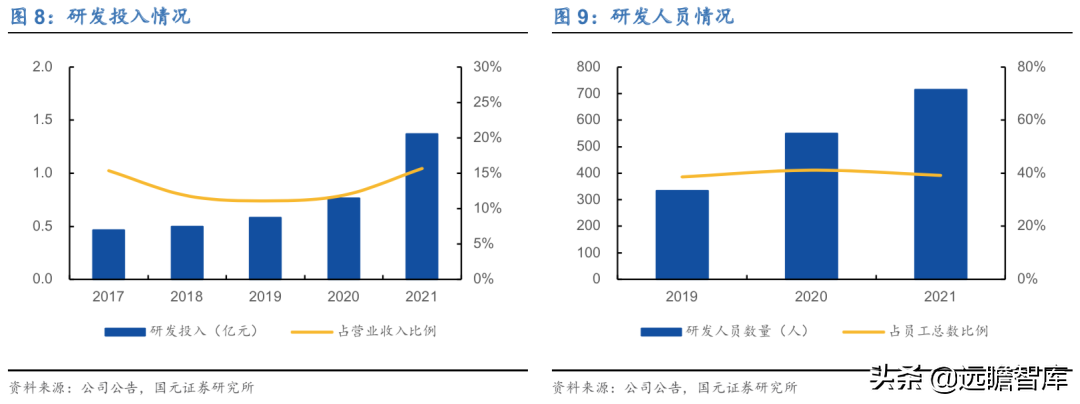 2021年,公司研发投入为1.37亿元,同比增长79.36%,占营业收入的比重为15.67%;研发序列人员为715人,同比增长30.24%,占公司员工总数的比例达到39.18%。
