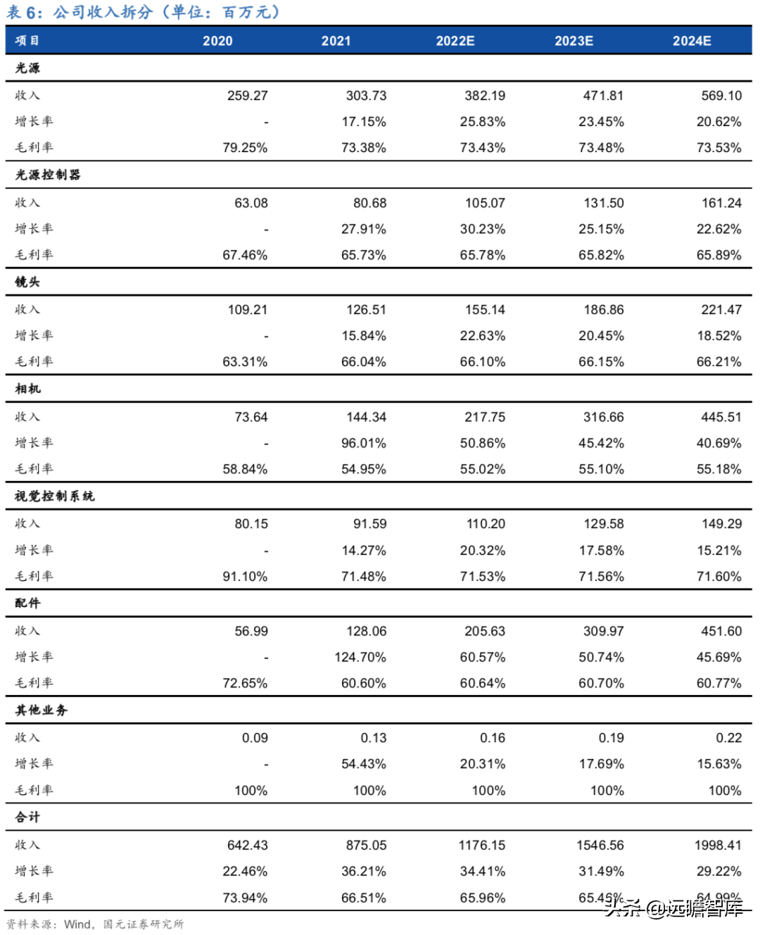 核心假设:公司是一家主要从事机器视觉核心软硬件产品的研发、生产和销售的自动化核心零部件供应商。目前,公司业务(产品)可分为:光源、光源控制器、镜头、相机、视觉控制系统、配件、其他业务。我们按照这七个维度来预测公司未来的收入和毛利率情况。