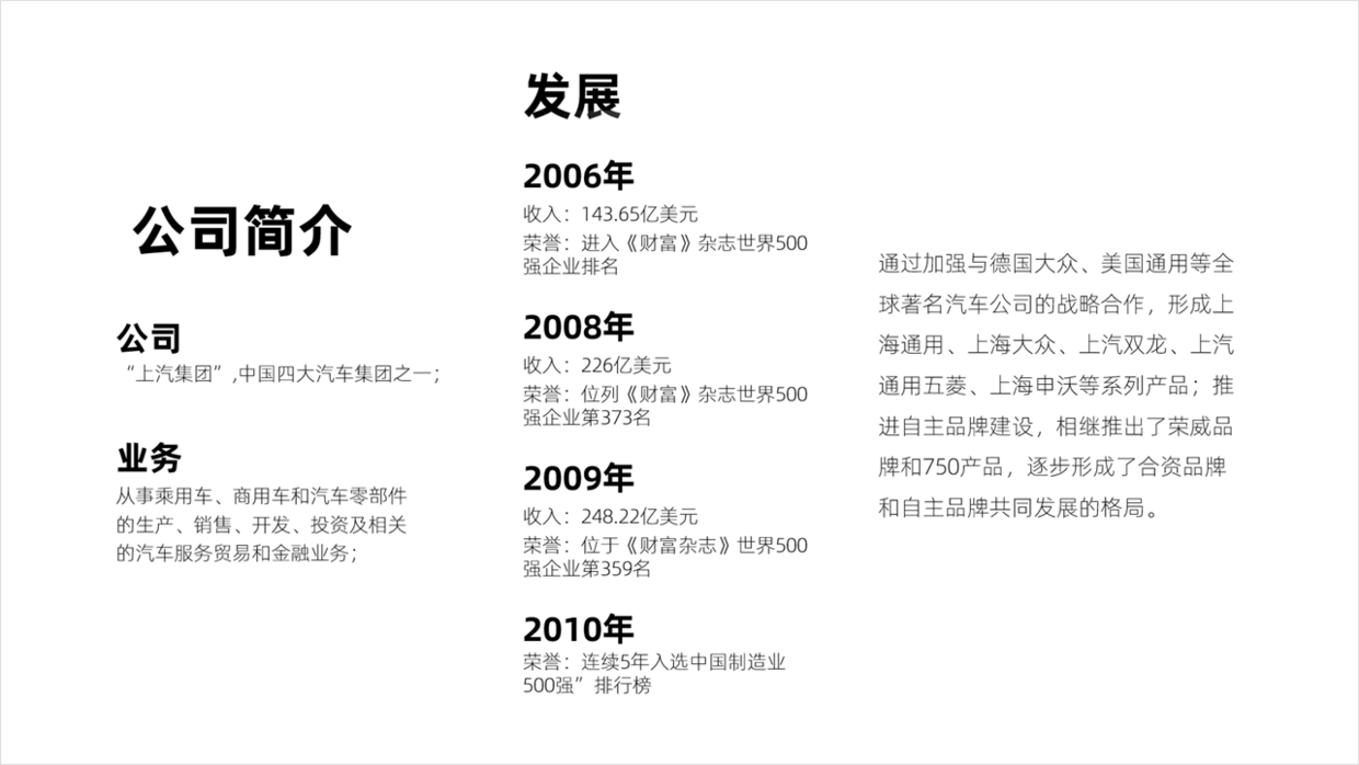 比如可以将其拆分为4个模块,公司、业务、发展,总结4个方面,这样页面就比较清晰。