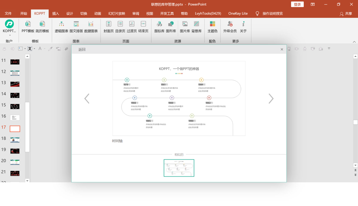 那么,关于这种特殊的【时间轴】,这里推荐大家可以在【KOPPT】插件中找到合适的,里面案例比较丰富。