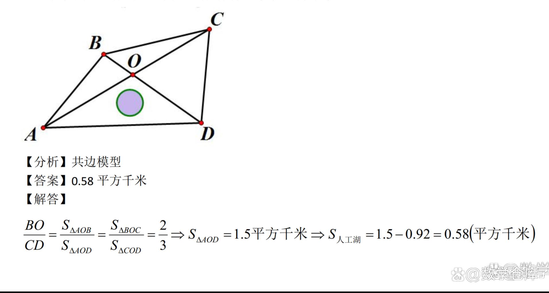 2.如图,某公园的外轮廓是四边形ABCD,被对角线AC、BD分成四个部分,△AOB面积为1平方千米,△BOC面积为2平方千米,△COD的面积为3平方千米,公园由陆地面积是6.92平方千米和人工湖组成,求人工湖的面积是多少平方千米?