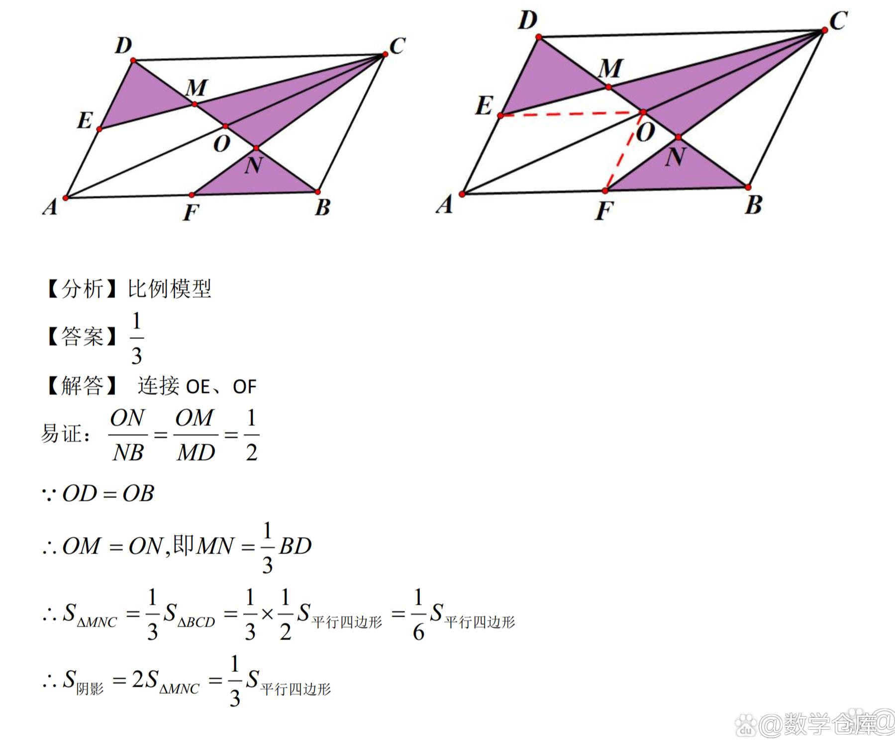 7.平行四面形ABCD中,对角线AC、BD交于一点O。E是AD中点,F是AB中点。CE交BD于点M,CF交BD于点N。求阴影部分面积占平行四边形面积的几分之几?