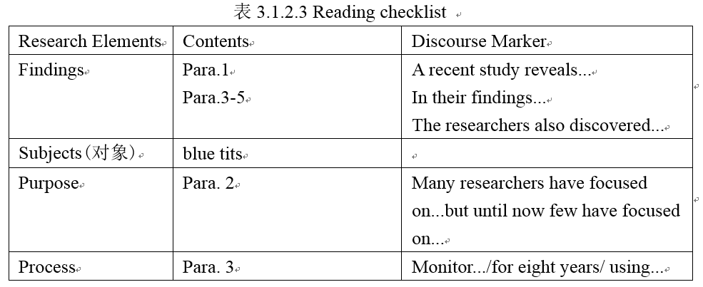 在呈现历年高考科普文阅读题题干后,提问学生预测到的科普文阅读需要关注的核心要素有哪些。学生很快从题干中推出科普文阅读的四大要素,分别为研究发现(research findings),研究对象(research subjects),研究目的(research purpose)和研究过程(research process)。科普文的核心要素在帮助学生理清篇章基本结构,提高学生阅读理解能力中起到很关键的作用。Pichert和Anderson(1977)的研究发现,篇章模式在语篇处理中有指引作用,在理解篇章模式明显对回述起了有力的组织作用(转引自桂诗春,2000);邹启明、童冰(2002)的研究表明,使用篇章结构来组织记忆的读者,所记信息明显优于不使用篇章结构的读者,所记信息明显优于不使用篇章结构的读者。