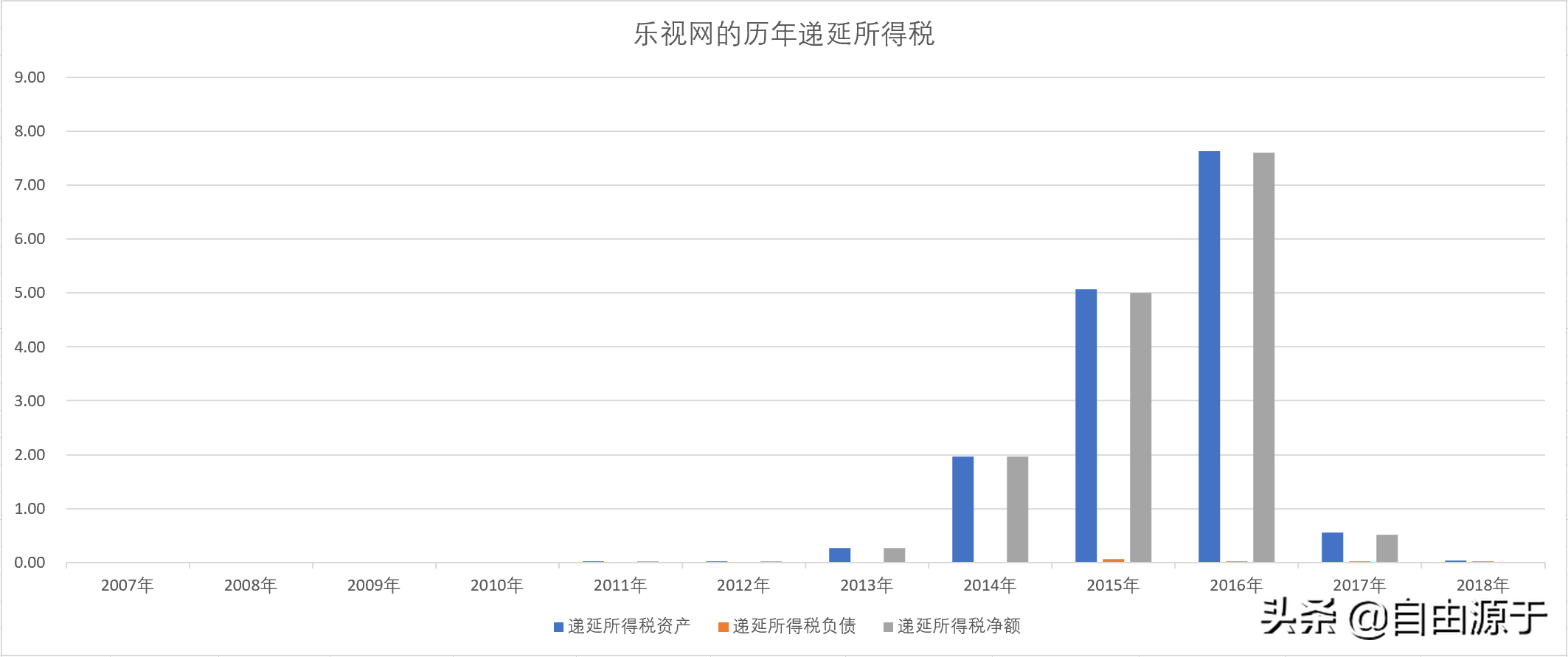 稍微留心一点,读者就能发现乐视网在2013年之前,基本上没有递延所得税资产,2014年开始该项科目开始突飞猛进,从2014年的1.96亿,到2015年的5.07亿,再到2016年的最高点7.63亿。