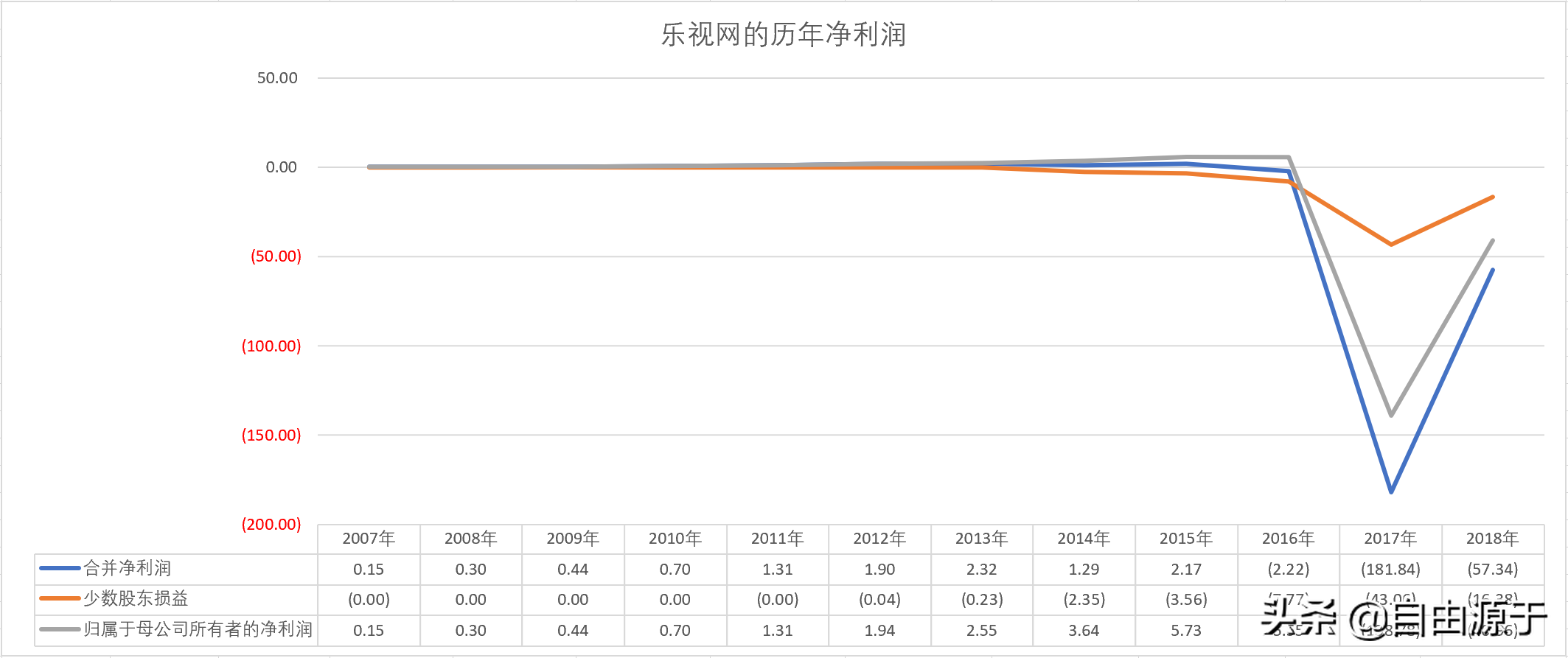 如果我们做个对比,以乐视网上市的2010年末数据作为起点,合并净利润到2015年末累计增长3.10倍;同期归母净利润累计增长8.19倍,而2015年末子公司少数股东的净利润为净亏损3.56亿元。