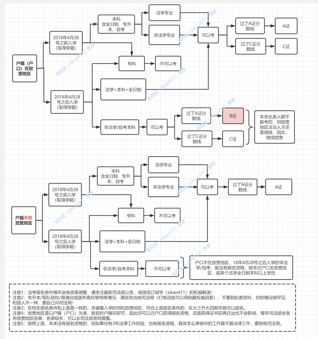 但如果你是2018年4月28号之后入学,而且户口也不在放宽地区,那么只有法学+全日制本科以上可以考,非法学不可以,非全日制不可以。详细的可以看下图: