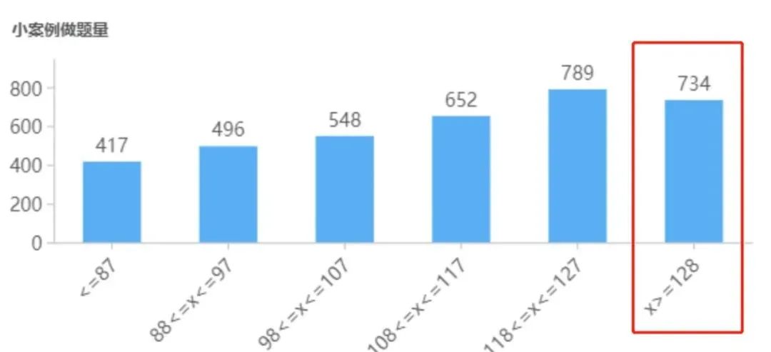 从上图可以看出,128分以上的人写的案例数量不是线性增长,还出现的下滑,比118-127分数段的人写的还少一些,但最终分数却高很多(换句话说,128分的人他们没那么努力,但主观题成绩就是好!)。