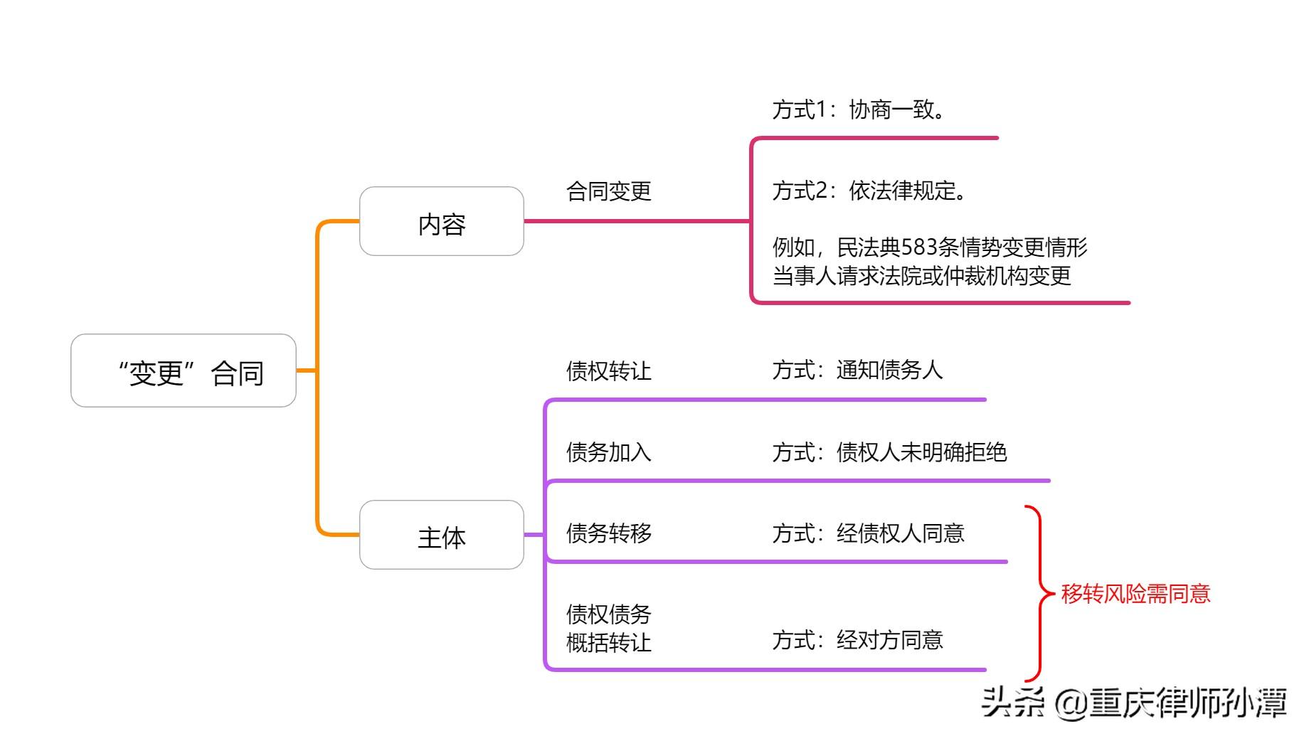 根据当事人“变更”合同的指向事项,合同的“变更”可以分为 合同变更(内容),债权转让,债务转移,债务加入,债权债务概括转让等类型。
