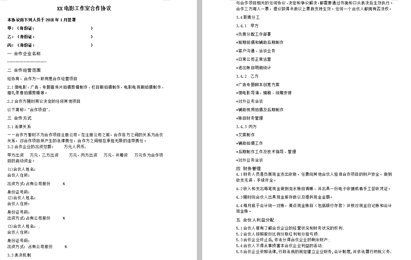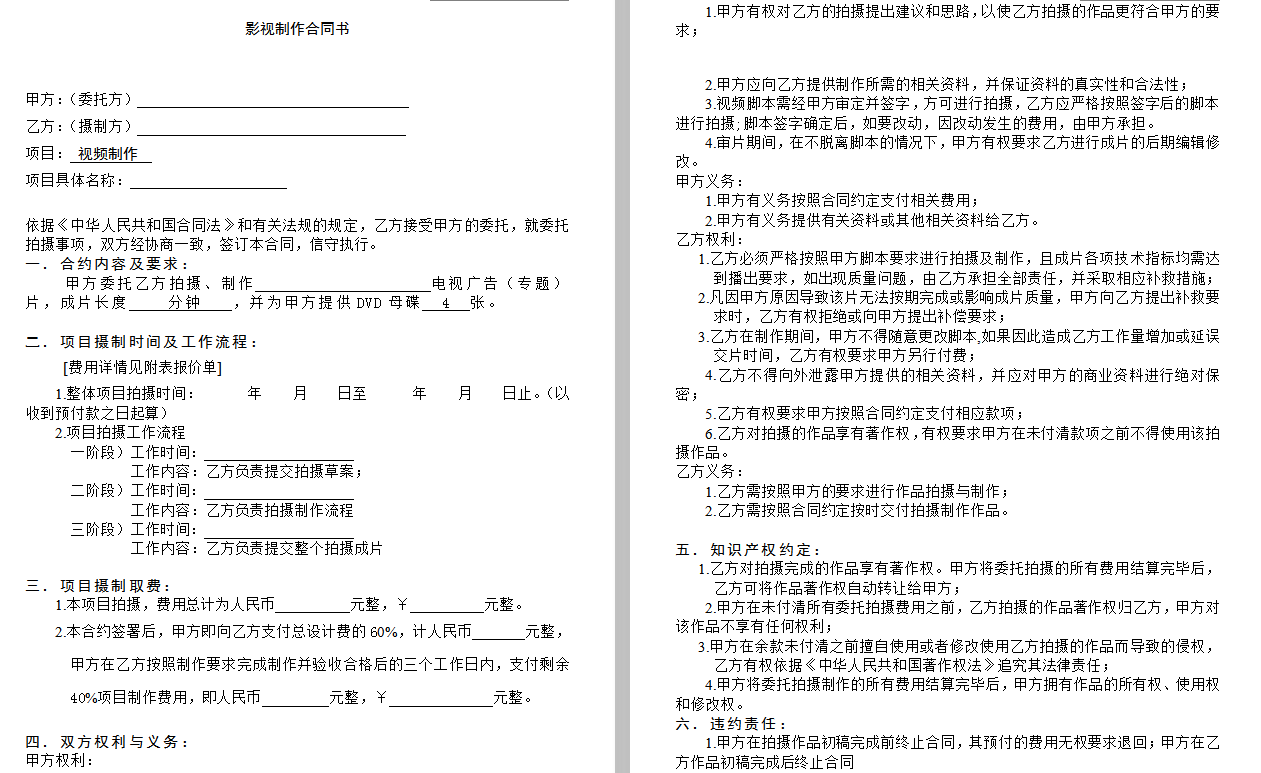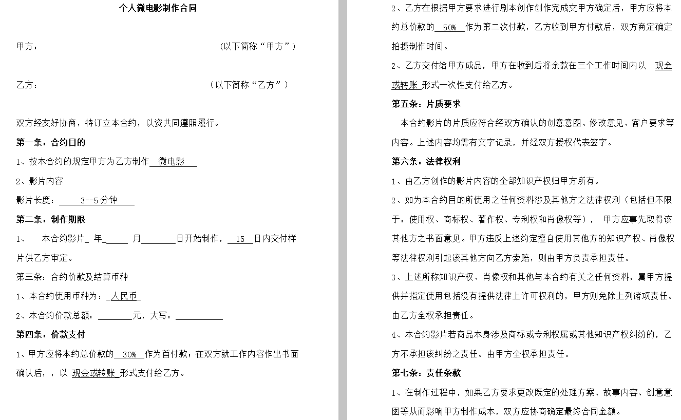 本节内容:个人微电影合同,合作拍摄电影合同书,视频工作室合作协议,影视拍摄合同。